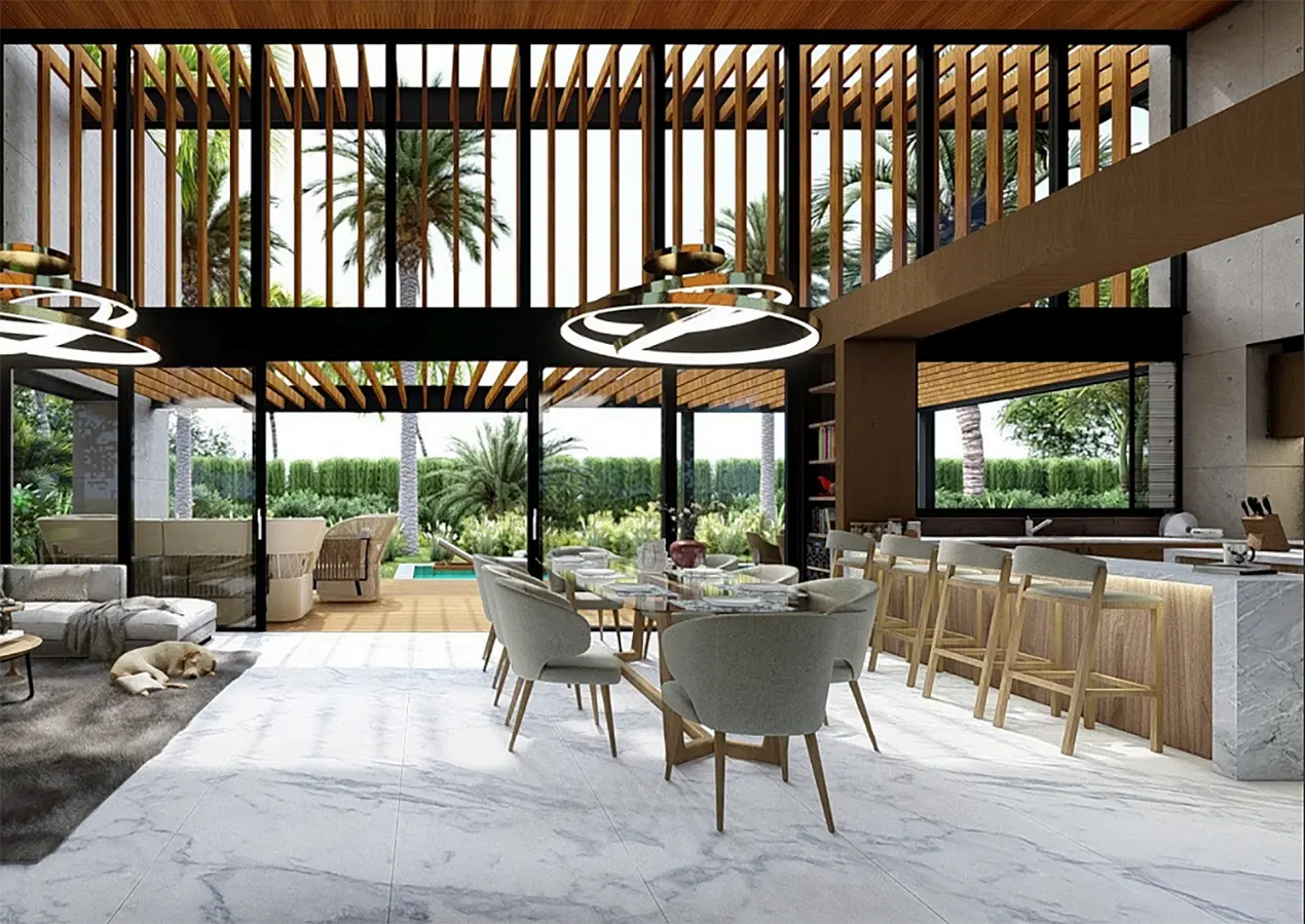 Amplios ventanales que se extienden desde el suelo hasta el techo, brindando la oportunidad de contemplar la naturaleza, sentir el clima cálido y disfrutar de los atardeceres que ofrece la zona.